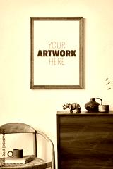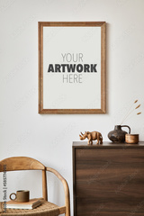 Minimalistic composition of creative living room interior with mock up poster frame, armchair and stylish small personal accessories on wooden commode. Copy space. Template. Real photo.