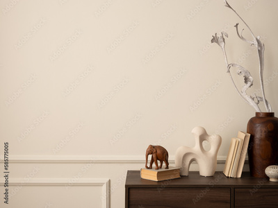 Minimalist composition of cozy living room interior with copy space, wooden sideboard, brown vase with dried flowers, modern sculpture, books and personal accessories. Homed decor. Template.