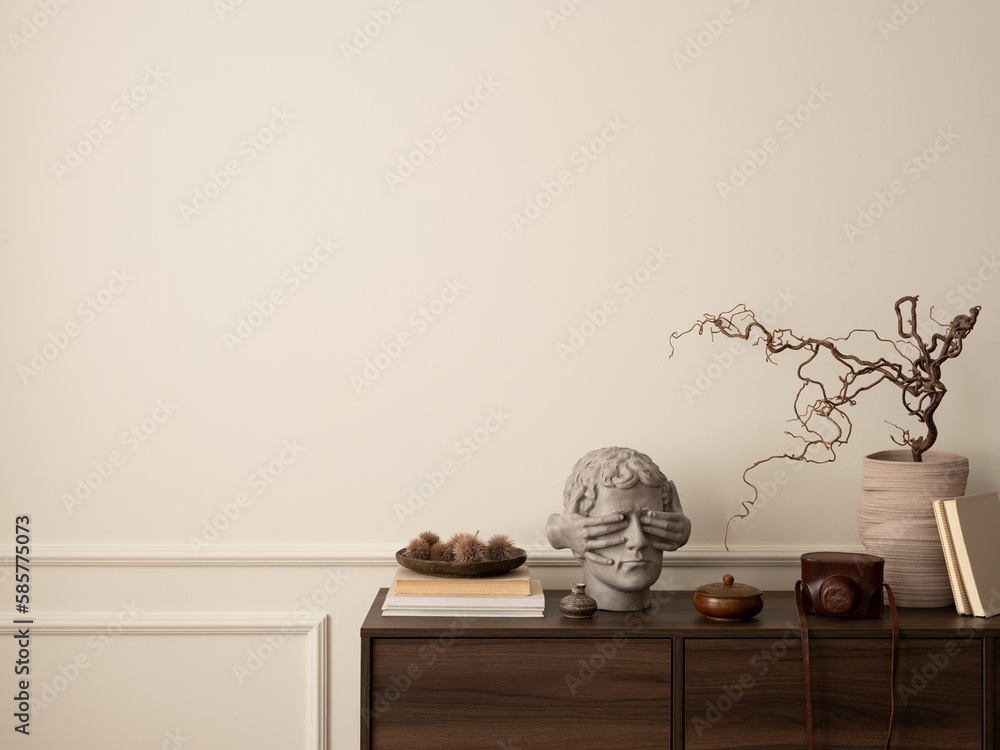 Minimalist composition of living room interior with copy space, wooden sideboard, vase with branch, modern sculpture, books, beige wall with stucco and personal accessories. Home decor Template.