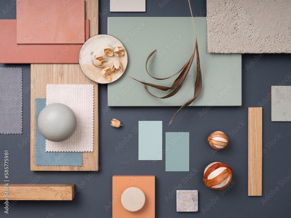 Creative flat lay composition with textile and paint samples, panels and cement tiles. Stylish interior designer moodboard. Blue, beige and brown color palette. Copy space. Template.