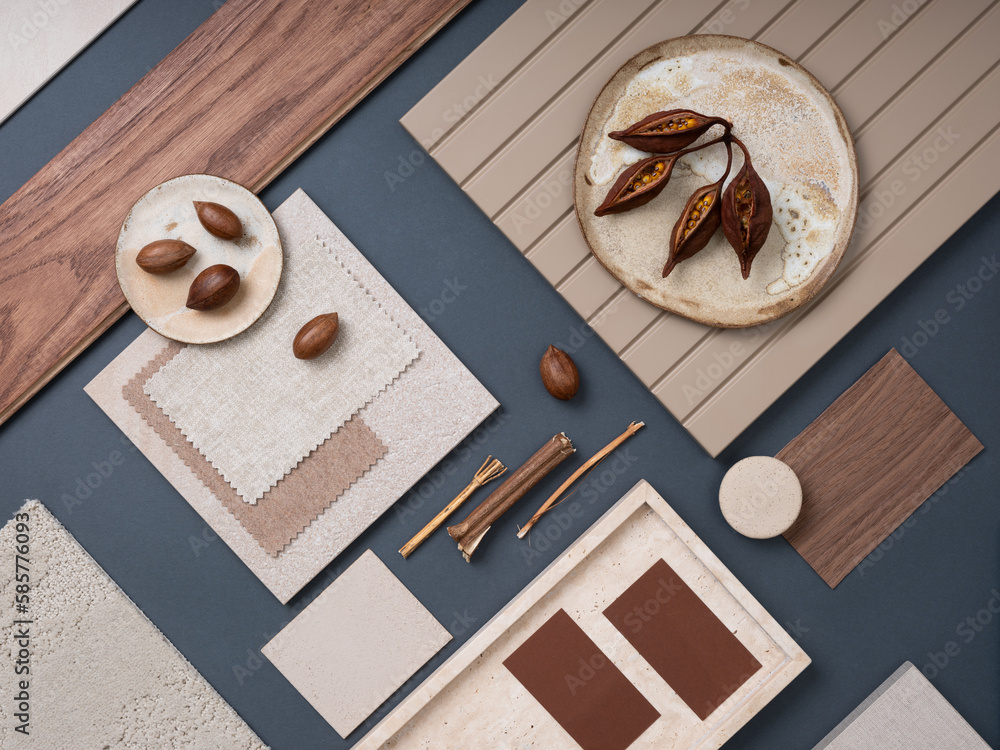 Creative flat lay composition with textile and paint samples, panels and cement tiles. Stylish interior designer moodboard. Blue, beige and brown color palette. Copy space. Template.