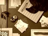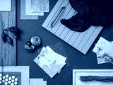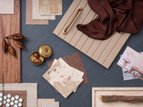 Creative flat lay composition with textile and paint samples, panels and cement tiles. Stylish interior designer moodboard. Blue, beige and brown color palette. Copy space. Template.