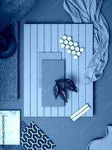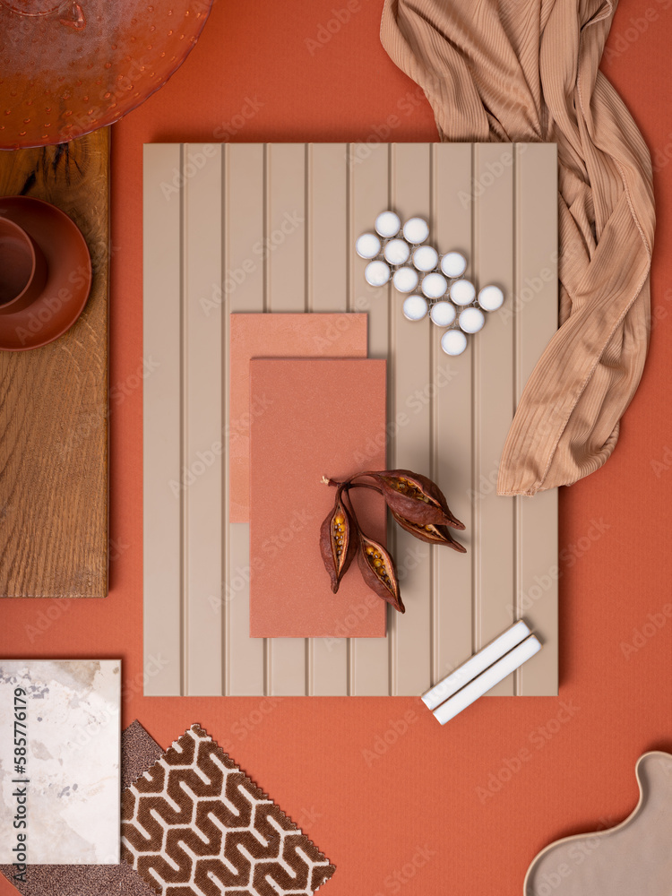 Stylish flat lay composition in orange and beige color palette with textile and paint samples, lamella panels and tiles. Architect and interior designer moodboard. Top view. Copy space.