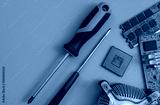 Computer chip of PC motherboard and screwdriver at repair workshop. Top view CPU chipset on blue background. Electronic components. Computer hardware. Upgrade computer processor chip. Chip shortage.