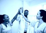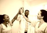 Three doctors share a high five, smile in hospital celebrate success