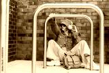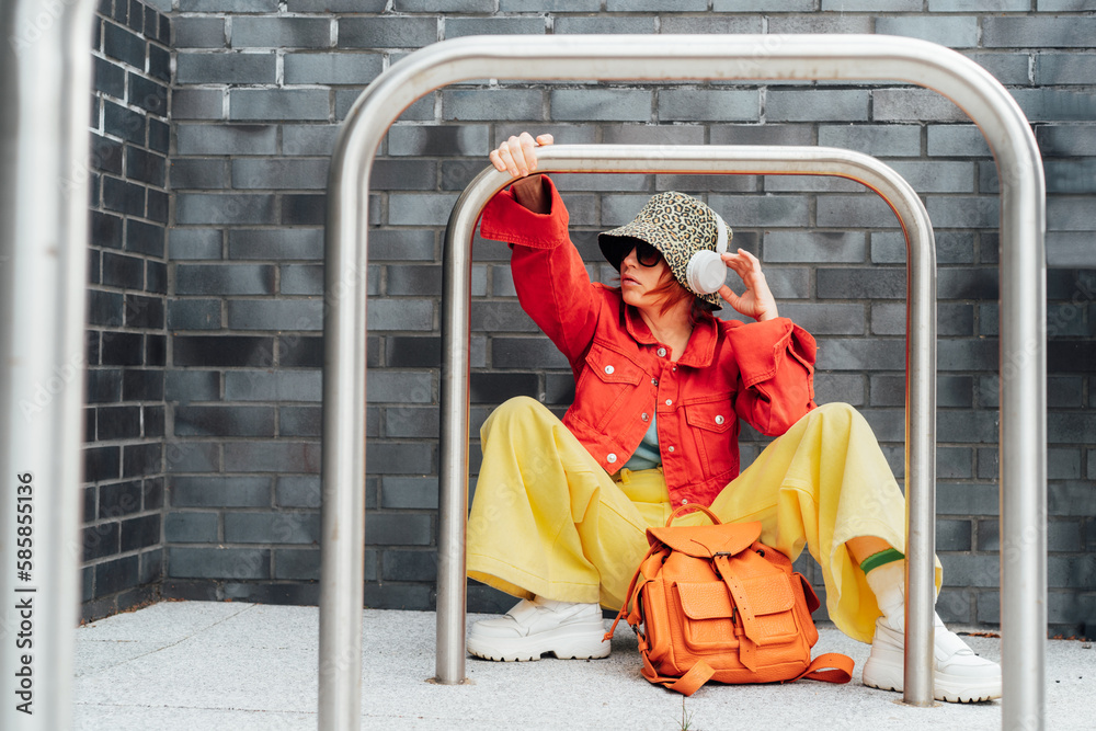 Hipster fashion young woman in bright clothes, sun glasses, bucket hat, backpack bag and earphones sitting near gray brick wall with bike stands frame. Urban city street fashion. Selective focus.