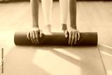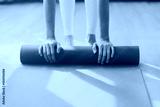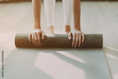 Fitness woman rolling Yoga mat before training, Healthy lifestyle.