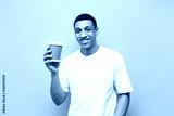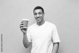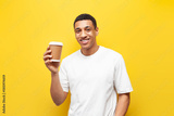 young african american guy in white t-shirt holds and recommends coffee in paper cup on yellow background