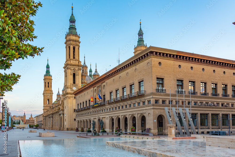 Sunrise view of the basilica de nuestra senora de pilar in Zaragoza, Spain