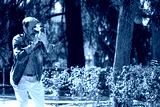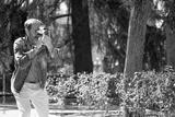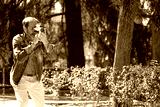 attractive middle-aged photographer taking pictures in the park with a vintage camera