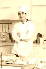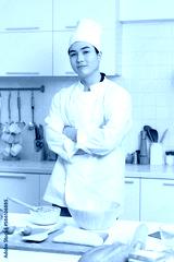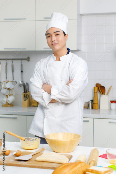 Portrait shot of Asian professional male pastry chef in white cooking uniform and tall cook hat standing smiling crossed arms look at camera posing at counter full of baking equipment and ingredients