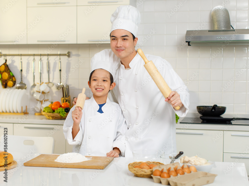 Millennial Asian young little cute boy pastry chef and male cooking teacher in uniform with white tall cook hat standing smiling holding wooden bakery rolling pin posing together in home kitchen
