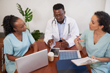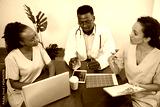 Serious doctor gestures while discussing in boardroom medical management meeting