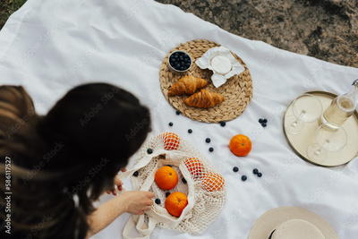 Woman organized picnic on the mountain. She put on the blanket a tasty croissants, oranges, brie and wine on the blancket.