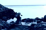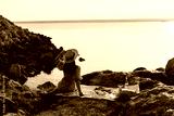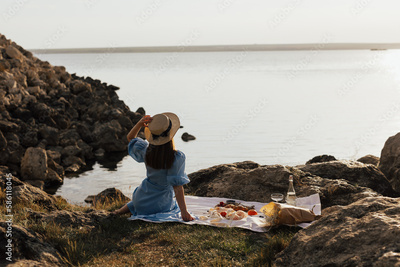 Woman in blue dress and hat having a romantic picnic on a hill overlooking the sea. She enjoying beautiful landscape.