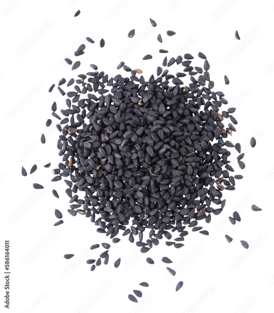 Black cumin seeds isolated on white background. Heap of black nigella seeds. Nigella sativa. Top view.