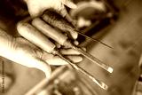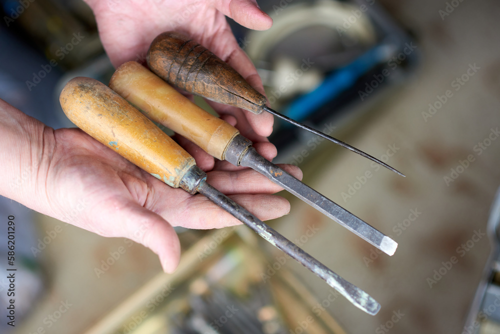 The master holds a set of tools in his hands - a chisel, an awl and a screwdriver with wooden handles