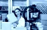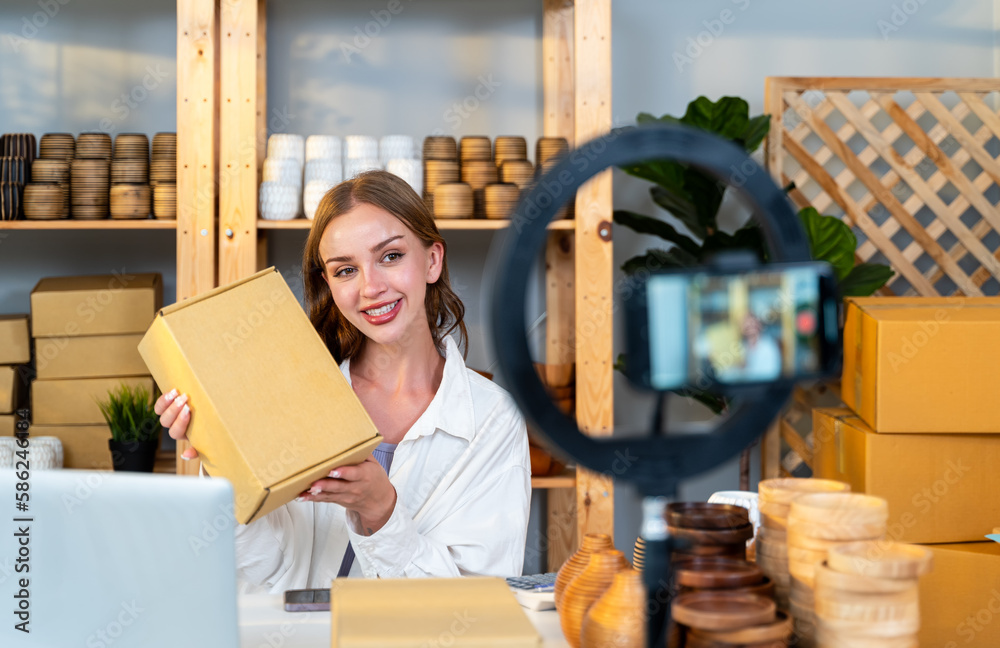 A woman is going live to sell products with her smartphone. She is presenting the goods in hand to those who are watching her steaming with a happy attitude in online sell and delivery concept.