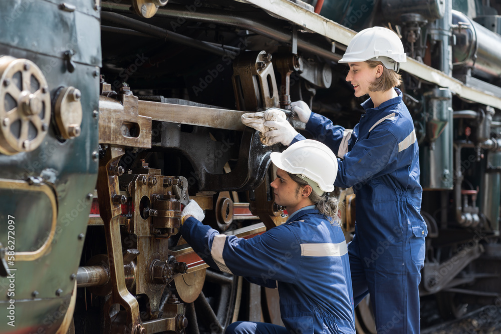 Male and female engineer maintenance locomotive engine, wearing safety uniform, helmet and gloves in locomotive repair garage. Male and female railway engineer use wrench repair train wheel in garage