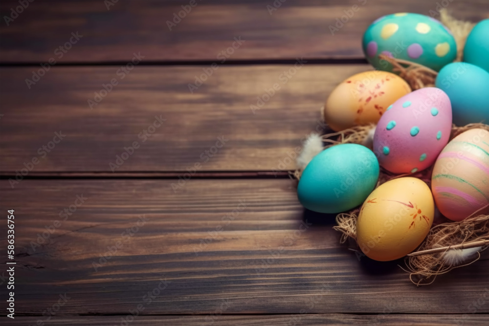 Happy Easter Day background and backdrop, cute bunny rabbit, ornament, and colorful egg, copy space greeting and backdrop, banner, rustic vintage design material. Celebrate Easter.