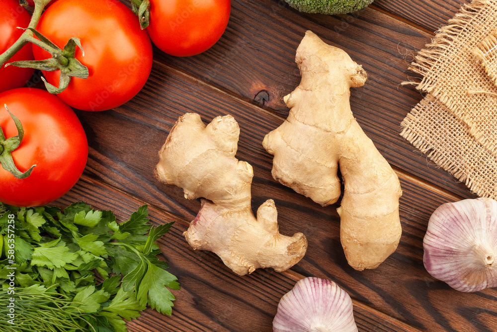 ginger root on wood background