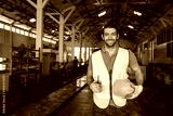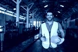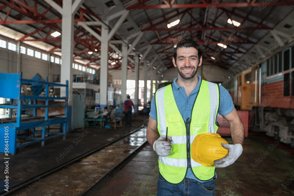Portrait of Engineer train Inspect the train's diesel engine, railway track in depot of train
