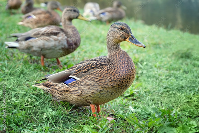 beautiful portrait of wild duck on green grass, abstract natural background. concept of care and waterfowl birds breeding, save wildlife. Animals theme