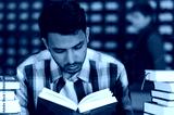 Portrait of cheerful male international Indian student with backpack, learning accessories standing near bookshelves at university library or book store during break between lessons. Education concept