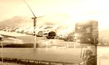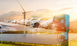 Sustainable energy for electric vehicle. EV car with electric vihicle charging station. Solar and wind turbine farm. Renewable, sustainable energy. Green energy. Solar, wind power. Sustainability.