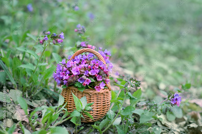 basket with spring flowers of pulmonaria close up in forest, blurred natural background. Fresh lungwort or pulmonaria flower, healing plant of early spring season. used in folk medicine when coughing.