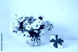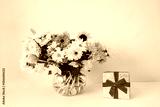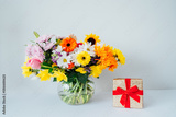 Round Vase with huge multicolor various mixed flower bouquet and shining golden gift box with red velvet ribbon on the white background. Mother's day, women day, valentine's day, birthday gift.