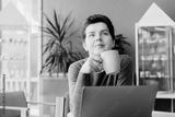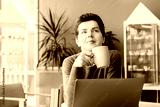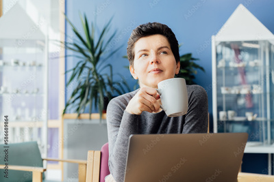 Middle aged minded pensive employee business woman in casual clothes holds coffee cup works at office desk with pc laptop. Achievement career concept. Dreaming, Taking time for recovery.