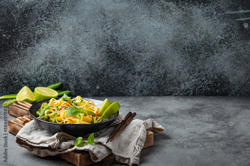 Asian vegetarian noodles with vegetables and lime in black rustic ceramic bowl, wooden chopsticks on cutting board angle view on stone background. Cooking noodles concept, copy space