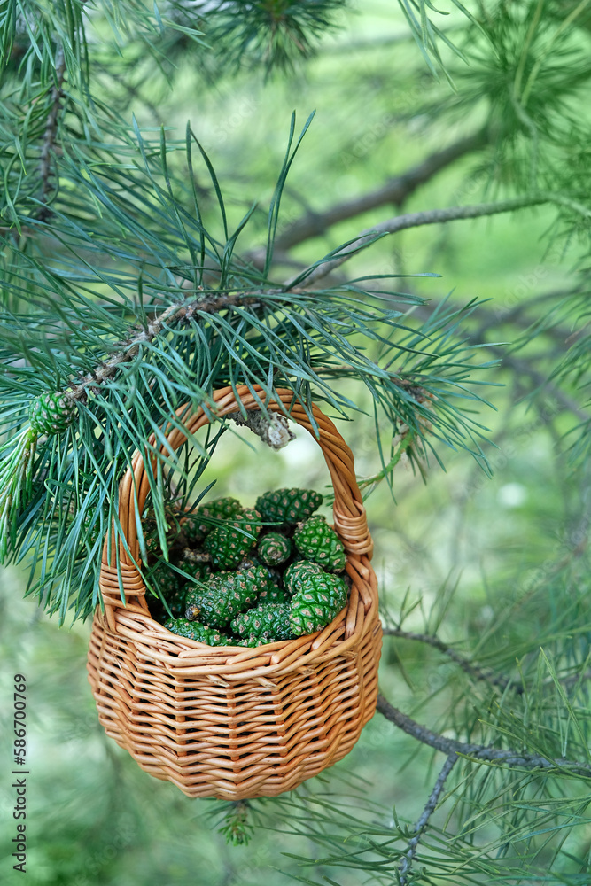 spring young green pine cones in basket on natural forest background. young pine tree cones picking for homemade healthy syrup cooking, used in folk medicine. healing ingredient, containing vitamins.