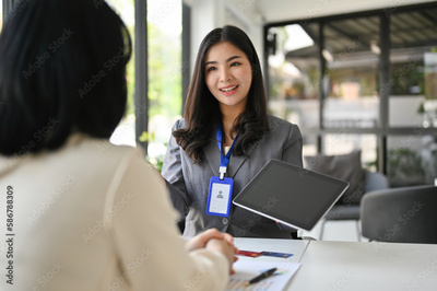 Confident Asian female banker discussing and planning an investment plan for her client.