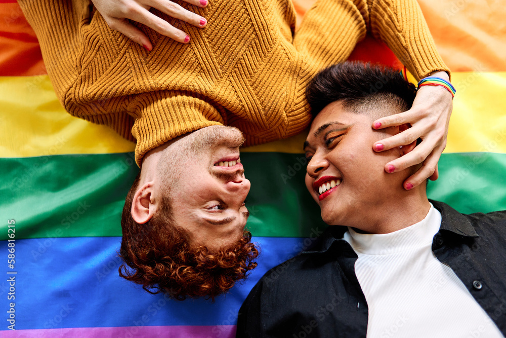 Gay couple lying on a lgtb rainbow flag