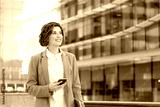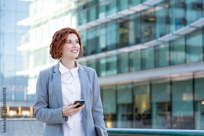 Young businesswoman smiling at copy space with phone and laptop in office area