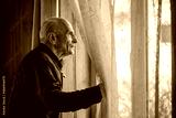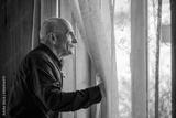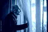 Single elderly man looking through window glass standing at home. Grandpa holding white curtain with hand and look out view from window.
