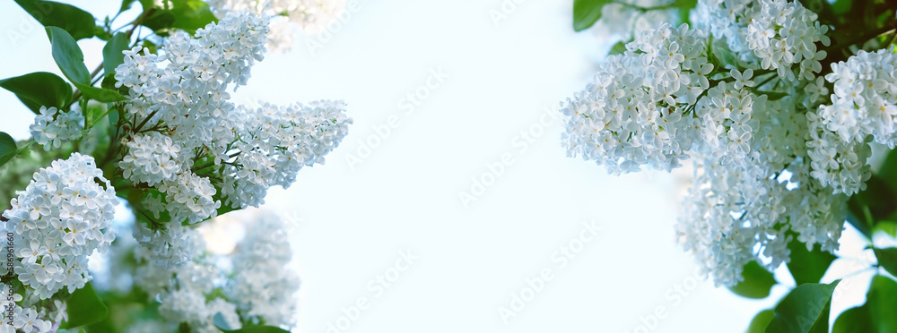 Spring beautiful white color lilac flowes on abstract green natural background. Floral gentle romantic floral image, spring season. banner. copy space. template for design