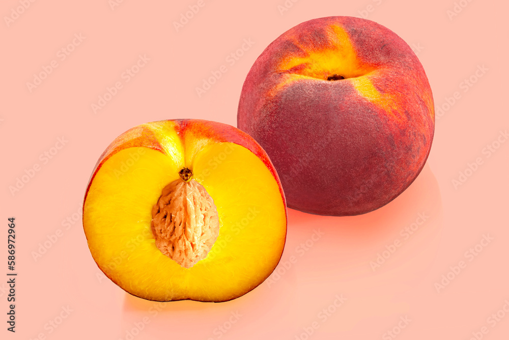 Ripe fresh Peaches, tropical nectarine fruit piece with pit