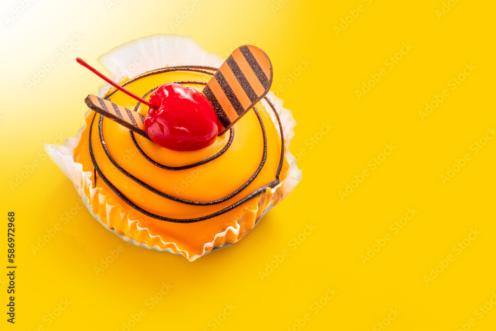 Chocolate yellow glazed cake with sugar cherries. Exquisite Fresh delicious dessert.