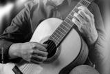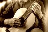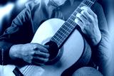 The guy in the dark shirt is plucking the strings of a six-string guitar
