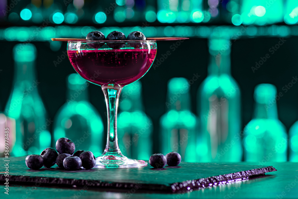 Cocktail in a glass on a bar counter in a restaurant, pub. Fresh prepared alcoholic cooler beverage at nightclub