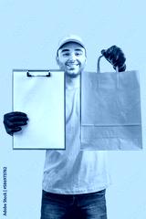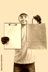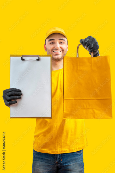 Delivery man with box. Staff laborer, orange uniform cap, t-shirt, coveralls service moving delivering orders goods. Guy holding cardboard package. Character, mockup design