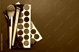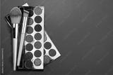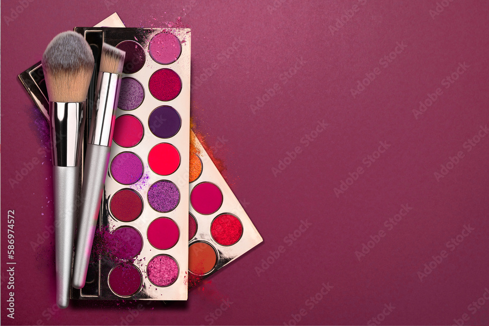 Bright eye shadow, blush brushes, explosion of multicolored powder dust on black background. Highly vibrant color-pressed pigment palettes for make-up. Abstract background for cosmetic concept.