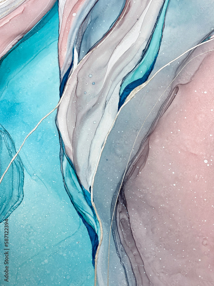 Abstract pink art with blue and silver — pink background with beautiful smudges and stains made with alcohol ink. Pink with blue fluid texture resembles flower, petals, watercolor or aquarelle.