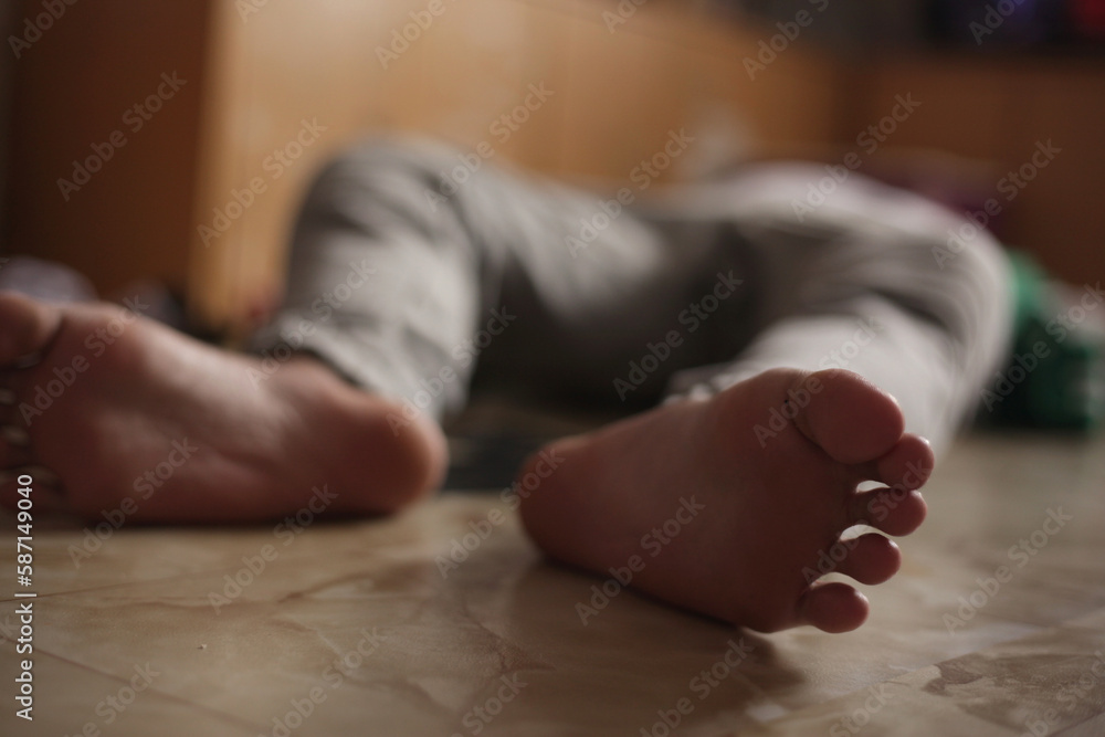 Barefoot man lying on floor, unconscious or dead, drugs overdose suicide, stroke heart attack health issue, or murder victim