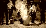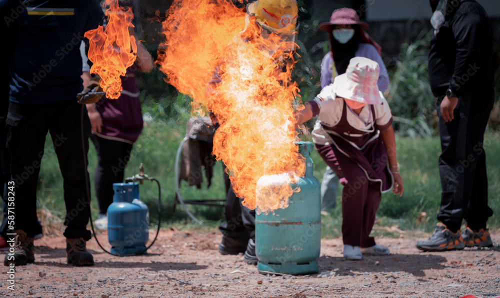 Firefighters under training open gas and fire to show danger conflagration preventive extinguisher training program is safety program concept