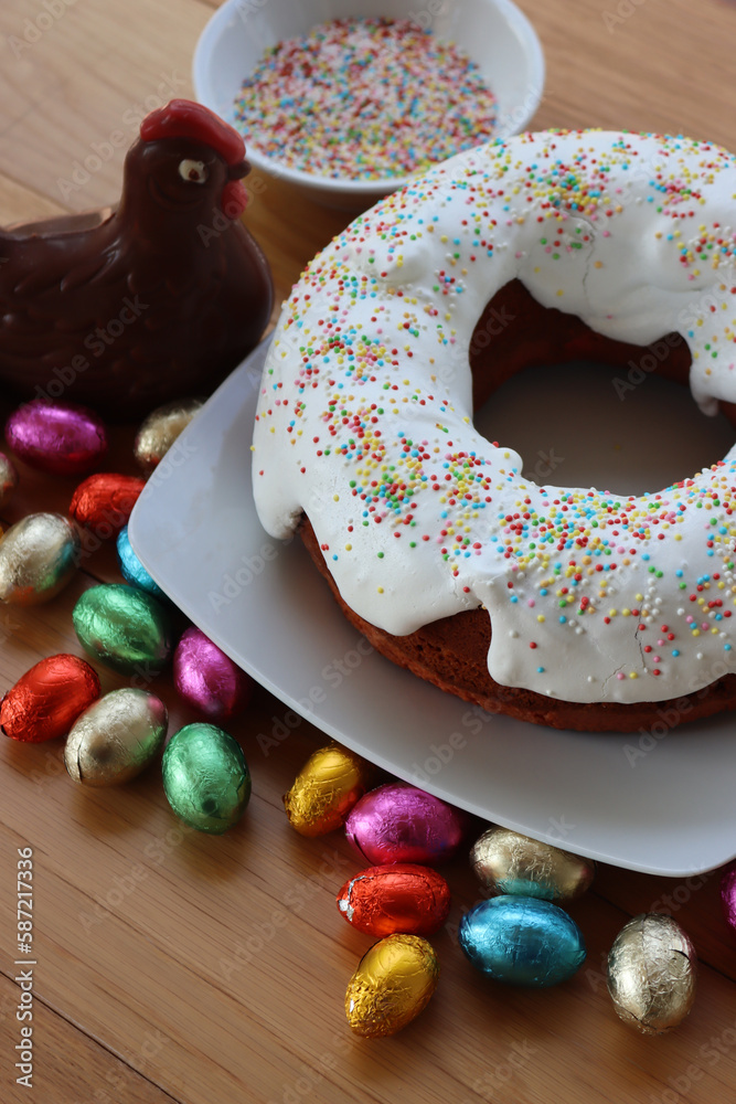 Ciaramicola, cake, sweet food, food, tradition, italy, italian culture,red, Easter, festive, symbol, celebration, donut shape, donut, shape, Alchermes, sprinkles, white color, glaze, icing, sugar, gla