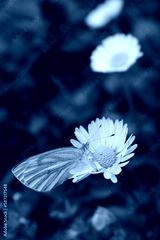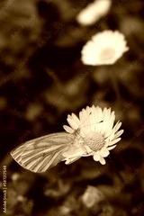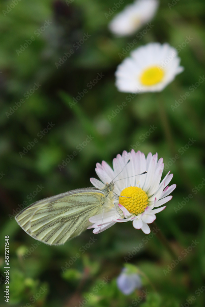 Male Green Veined White feeding on a Common daisy flower in the meadow. Pieris Napi on Bellis perennis
